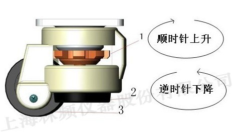 1、升降轉(zhuǎn)盤。 2、固定底座。 3、移動滾輪。 A、移動試驗箱: 順時針方向旋轉(zhuǎn)升降轉(zhuǎn)盤,固定底座將往上移動,轉(zhuǎn)動每個輪子的升降轉(zhuǎn)盤,使每個輪子的固定底座都離開地面,確保所有移動滾輪著地,此時便可方便的移動設(shè)備到所需位置。 B、固定試驗箱:把箱體移動到所需位置后,逆時針方向下調(diào)升降轉(zhuǎn)盤,將移動滾輪升起,使固定底座與地面接觸,使箱體基本固定。此時再用水平儀測量箱體是否水平?赏ㄟ^升降轉(zhuǎn)盤調(diào)節(jié)箱體各部分的高度,各部分升降轉(zhuǎn)盤調(diào)到適當?shù)奈恢煤笸V剐D(zhuǎn),確保試驗箱處于水平狀態(tài)時。