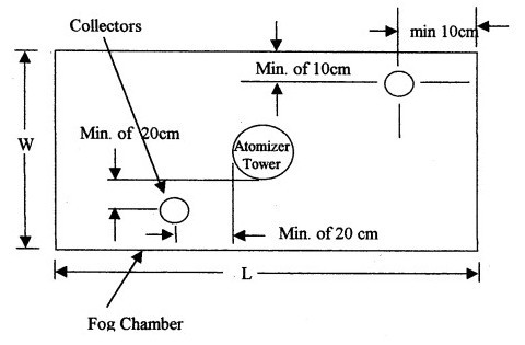 鹽霧試驗(yàn)箱霧化和鹽霧量---在每個(gè)霧化塔暴露區(qū)域內(nèi),至少放入兩個(gè)干凈的鹽霧收集器,不會(huì)收集到測(cè)試樣品上的液滴或其他的液滴。調(diào)整收集器位置使之靠近樣品,一個(gè)離任一噴嘴的位置都近,另一個(gè)離所有噴嘴的位置遠(yuǎn)。圖1是一種典型的布置。基于平均運(yùn)行16小時(shí)基礎(chǔ)上(注釋9),水平收集區(qū)域方向上每80cm2 (12.4in.2),每小時(shí)將收集1.0—2.0ml的溶液。收集的氯化鈉溶液的濃度將達(dá)到5±1%質(zhì)量比(備注9-11)。收集的溶液的PH值將為6.5—7.2,按照8.2所述方法測(cè)量PH值(備注3)。