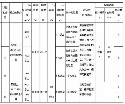 附注:1. 關(guān)于“粉塵”,原則上為干燥狀態(tài)的粉塵。對于試驗(yàn)槽內(nèi)的環(huán)境,當(dāng)需要特別的高溫或者特別的低溫時,或者需要提供潮濕氣體時,由交接的雙方相互協(xié)商確定。